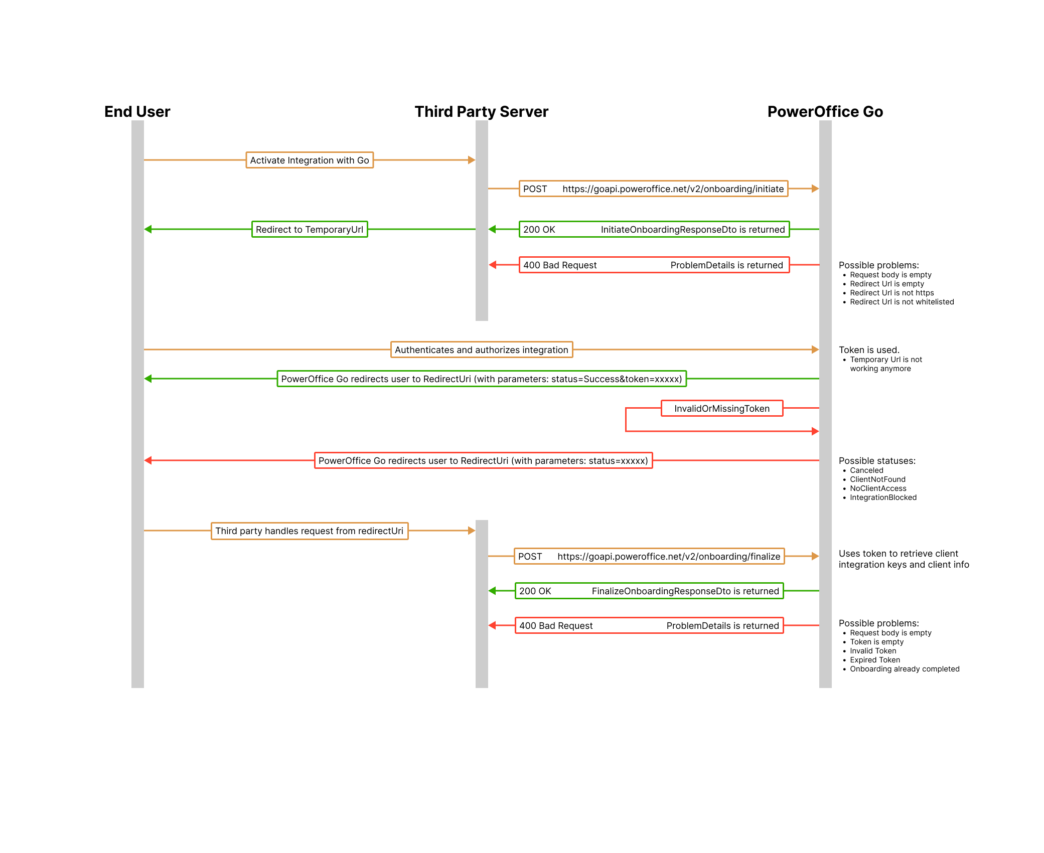 The onboarding workflow is a process that is initiated in your end (your system), allowing a user to login to Go and accept onboarding and activation of your integration for the relevant client(s) the user have access to. The end result of the onboarding is that your integration is activated on the client(s), and the clientkey(s) returned to you in a secure manner abstracted from the user. Meanwhile, the user is redirected to an url of your choosing.